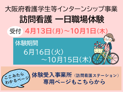 事業所案内 お近くの事業所を検索 入会・継続案内 変更届もこちらから 訪問看護師を目指す方へ 看護学生の方も 研修情報 SEMINAR 更新日 : 2026.01.05 2026年度 「新卒訪問看護師スタート・プログラム」参加者募集 詳細 更新日 : 2026.04.01 2026年度 新任訪問看護師研修Ⅰ期 詳細 更新日 : 2025.05.23 2026年度訪問看護インターンシップ〜 一日職場体験〜のご案内 詳細 更新日 : 2026.04.06 令和8年度 報酬改定のポイント 詳細 研修情報一覧 お知らせ NEWS 2026.03.30 重要なお知らせ 2026年度 会員継続手続きをお願いします! 2026.03.26 行政機関 令和7年度厚生労働省補正予算事業「大阪府医療機関等における賃上げ・物価上昇に対する支援事業」:問い合わせ多い内容について 2026.03.17 行政機関 締切間近! 【大阪府再周知:3/27〆切】「大阪府医療機関等物価高騰対策一時支援金」の申請について 2026.02.25 協会からのお知らせ 2026年度 研修計画一覧・研修要領を掲載しました! 2026.02.24 行政機関 大阪府社会福祉施設等従事者支援事業(第3弾)の申請について お知らせ一覧 災害対策情報 会員専用ページID・パスワードが不明の際はお問い合わせください ブロック活動 委員会活動 広報誌「ささえあい」 教育ステーションのご紹介 三島ブロック 豊能ブロック 北河内ブロック 中河内ブロック 市北ブロック 市西ブロック 市東ブロック 市南ブロック 堺ブロック 南河内ブロック 泉南ブロック 教育ステーションは、大阪府の訪問看護実践研修事業として、訪問看護サービスの向上を目指した事業です。身近な地域での、訪問看護の実践的な研修や医療介護との連携及び訪問看護の情報等が受けられる仕組みを整備し、訪問看護師の確保・育成・定着を図ります。 詳細はこちら