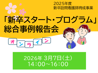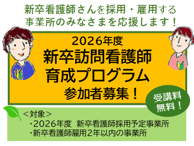 事業所案内 お近くの事業所を検索 入会・継続案内 変更届もこちらから 訪問看護師を目指す方へ 看護学生の方も 研修情報 SEMINAR 更新日 : 2026.01.08 2025年度 「新卒スタート・プログラム」総合事例報告会 詳細 更新日 : 2026.01.05 2026年度 「新卒訪問看護師スタート・プログラム」参加者募集 詳細 更新日 : 2025.11.11 2025年度 新卒訪問看護師育成セミナー 詳細 更新日 : 2025.11.11 2025年度 訪問看護多機能部会交流会 詳細 更新日 : 2025.11.10 2025年度 第2回精神科訪問看護研修会~精神科訪問看護基本療養費算定要件となる研修会~ 詳細 更新日 : 2025.11.06 2025年度 訪問看護管理者研修(基礎コースⅡ期) 詳細 更新日 : 2025.10.15 2025年度 運営基準・情報公表調査関連研修(運営基準・介護サービス情報の公表制度に伴う研修)最終募集 詳細 研修情報一覧 お知らせ NEWS 2026.01.05 行政機関 介護保険最新情報Vol.1454「令和7年度介護分野の職員の賃上げ・職場環 境改善支援事業の実施について」 2026.01.05 協会からのお知らせ 訪問看護師をめざす看護学生の皆様へ 動画の案内 2025.12.26 協会からのお知らせ 事務局の年末年始と会員ページパスワード変更のお知らせ 2025.12.10 行政機関 医療措置協定を締結している事業所は運営・実施状況等の報告をお願いします 2025.11.20 研修関連 第11回 大阪府訪問看護シンポジウム2025 資料 お知らせ一覧 災害対策情報 会員専用ページID・パスワードが不明の際はお問い合わせください ブロック活動 委員会活動 広報誌「ささえあい」 教育ステーションのご紹介 三島ブロック 豊能ブロック 北河内ブロック 中河内ブロック 市北ブロック 市西ブロック 市東ブロック 市南ブロック 堺ブロック 南河内ブロック 泉南ブロック 教育ステーションは、大阪府の訪問看護実践研修事業として、訪問看護サービスの向上を目指した事業です。身近な地域での、訪問看護の実践的な研修や医療介護との連携及び訪問看護の情報等が受けられる仕組みを整備し、訪問看護師の確保・育成・定着を図ります。 詳細はこちら