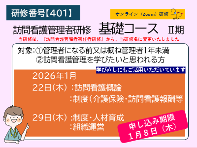 研修情報一覧 すべてのカテゴリー 新卒訪問看護師等 新任訪問看護師等 ジェネラリスト 訪問看護管理者等 その他研修 更新日 : 2025.11.06 2025年度 訪問看護管理者研修(基礎コースⅡ期) 詳細 関連ページ 研修要領 オンライン研修受講について Zoomチャレンジ体験